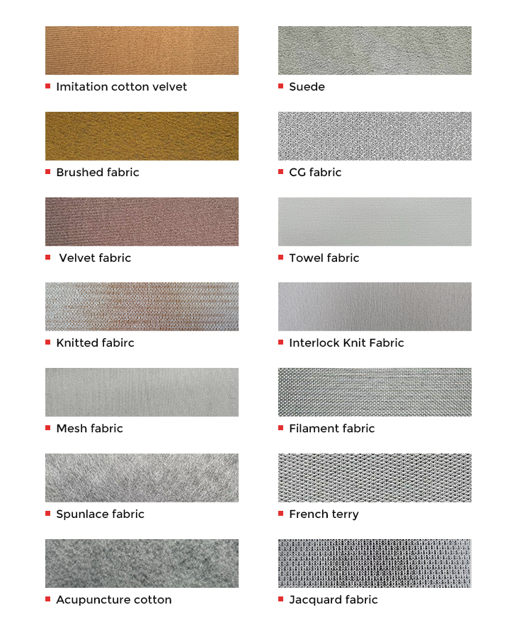 | Backing Technics | Gebreide 、 geborsteld 、 niet-geweven 、 Franse Terry |